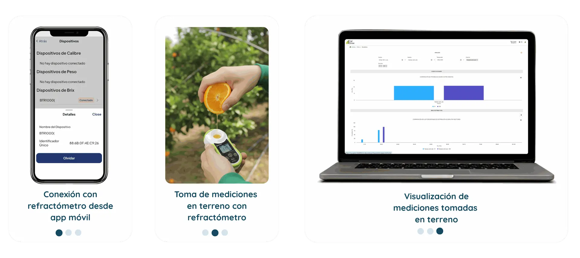 Conecta el BX55 a CalGrow Mobile y registra automáticamente cada medición. Los datos se sincronizan con la plataforma web, generando gráficos comparativos y reportes en tiempo real que facilitan el seguimiento de la calidad y el momento óptimo de cosecha.